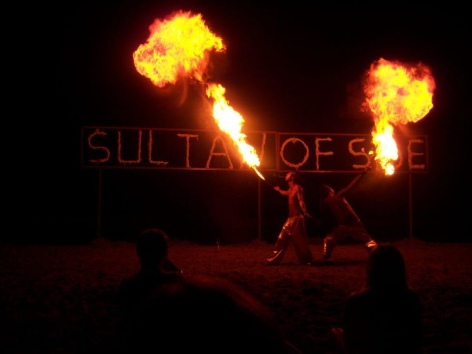 vuurspugen tijdens beachparty