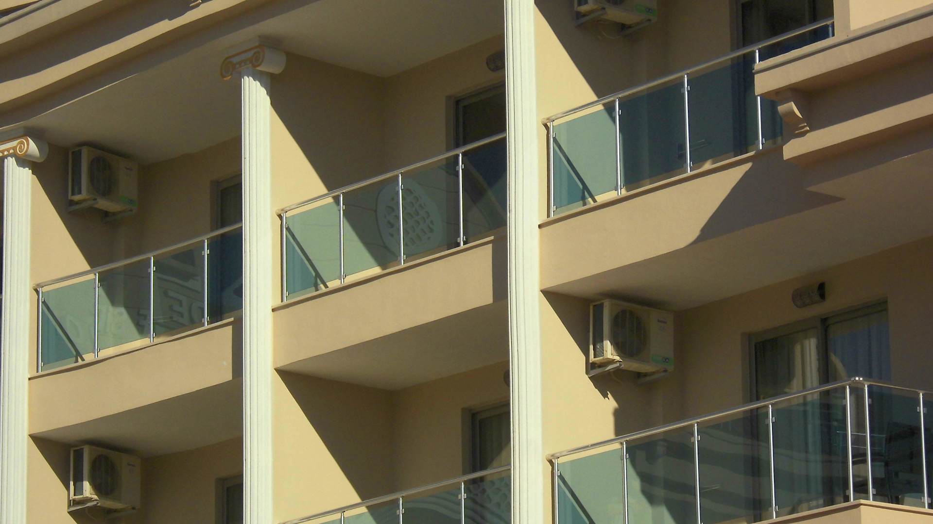 Auf und an den Balkons sind die Klimageräte