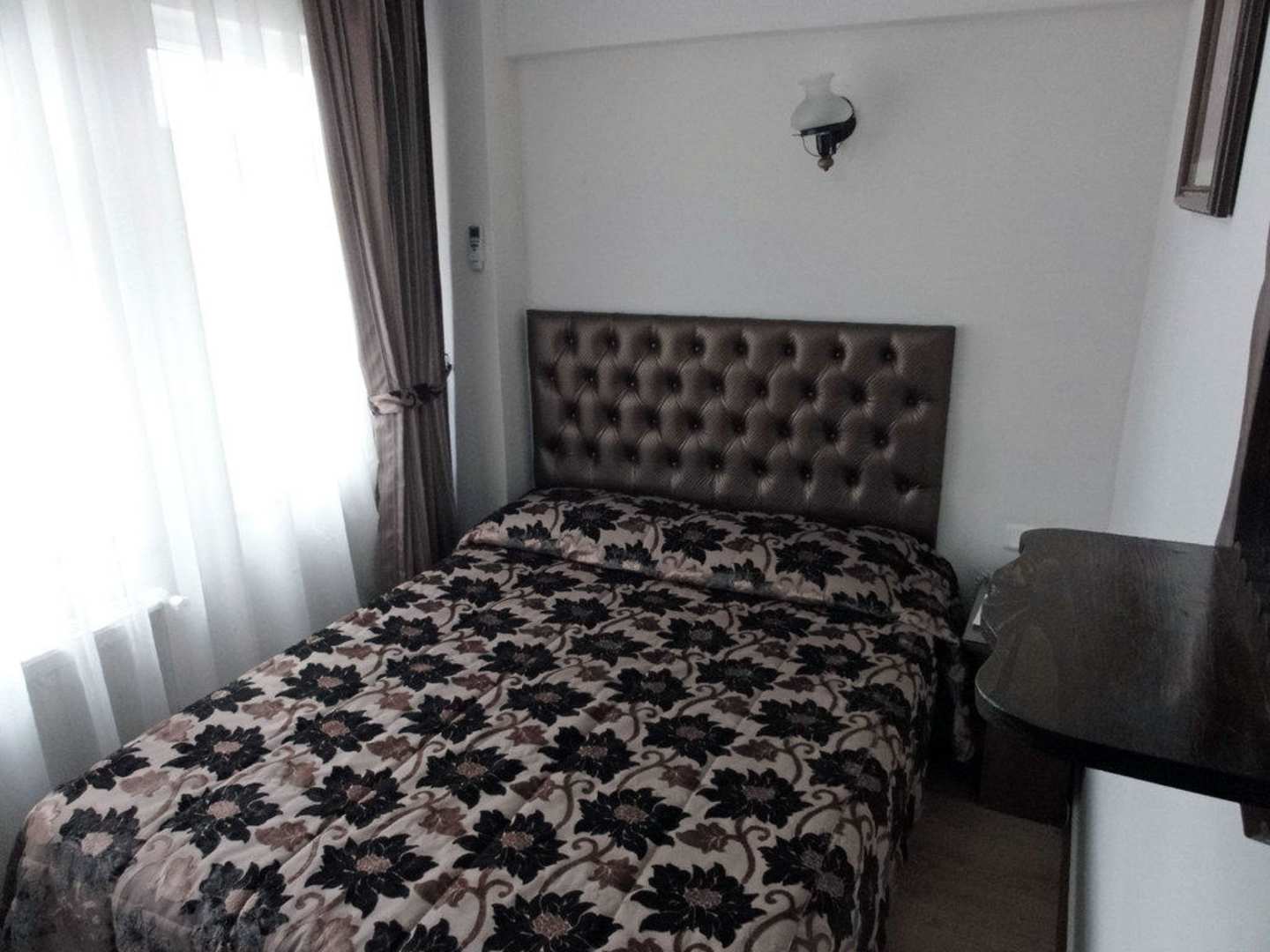 BettnischeAm Fußende des Bettes befinden sich lediglich noch eine Garderobe, ein Kühlschrank (darüber TV) und ein Stuhl