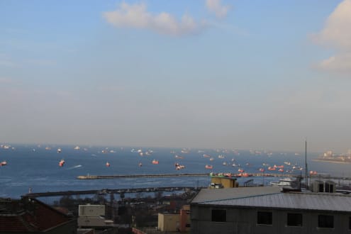 Der Blick von der Frühstücksterrasse des Hotels Sultanhan am frühen Morgen auf die Dächer Istanbuls und die Schiffe auf dem Bosporus.