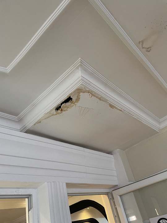 Die Terrasse, wo man Speisen kann. Man sieht auch deutlich 4/5 Streifen, dieses deuten drauf hin das Wasser aus der Decke fällt. Auf die Gäste ist es auch paar mal gefallen.