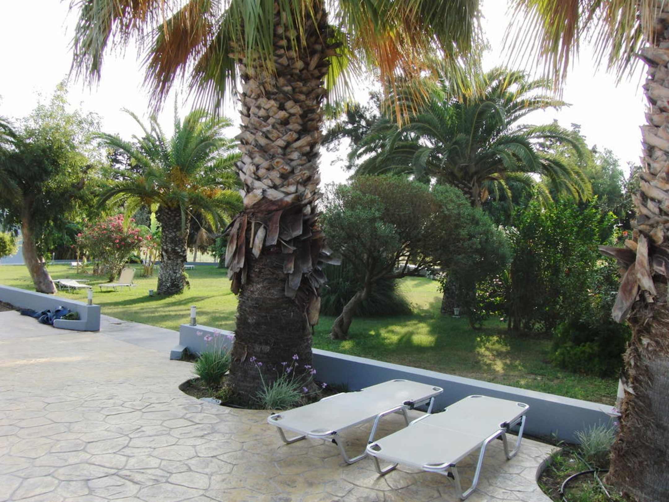 Neben dem Pool befindet sich eine Wiese mit Liegen