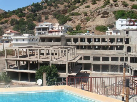 Blick vom Pool auf eine Bauruine