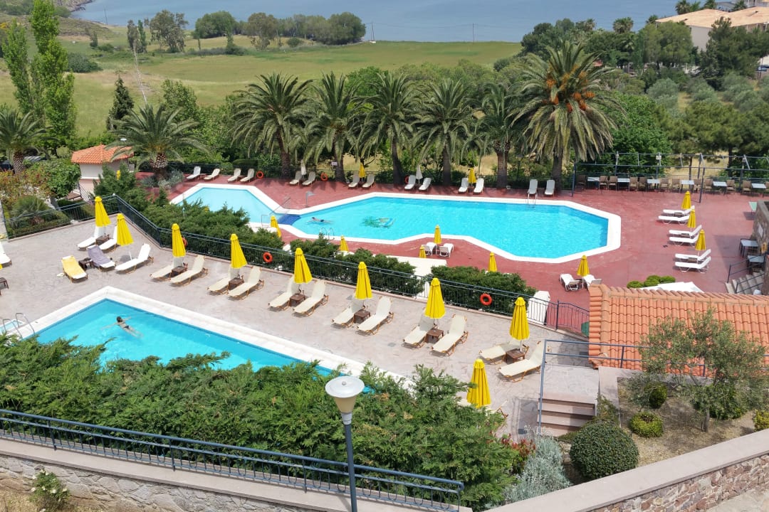 von unserem Balkon über die Pools im Hintergrund das Meer...