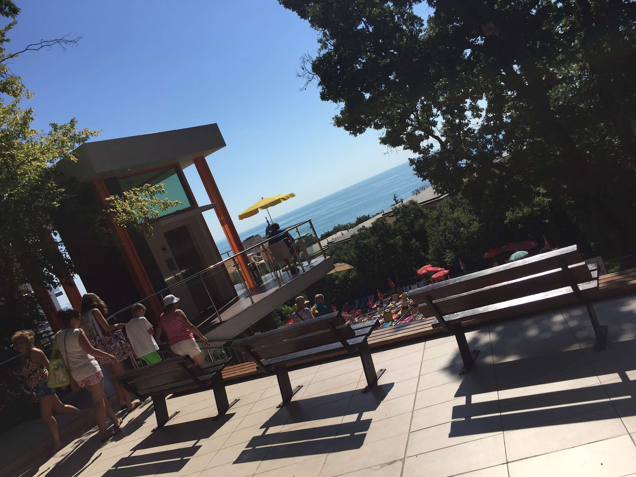 Blick vom Restaurant (draußen) über die Anlage zum Meer
