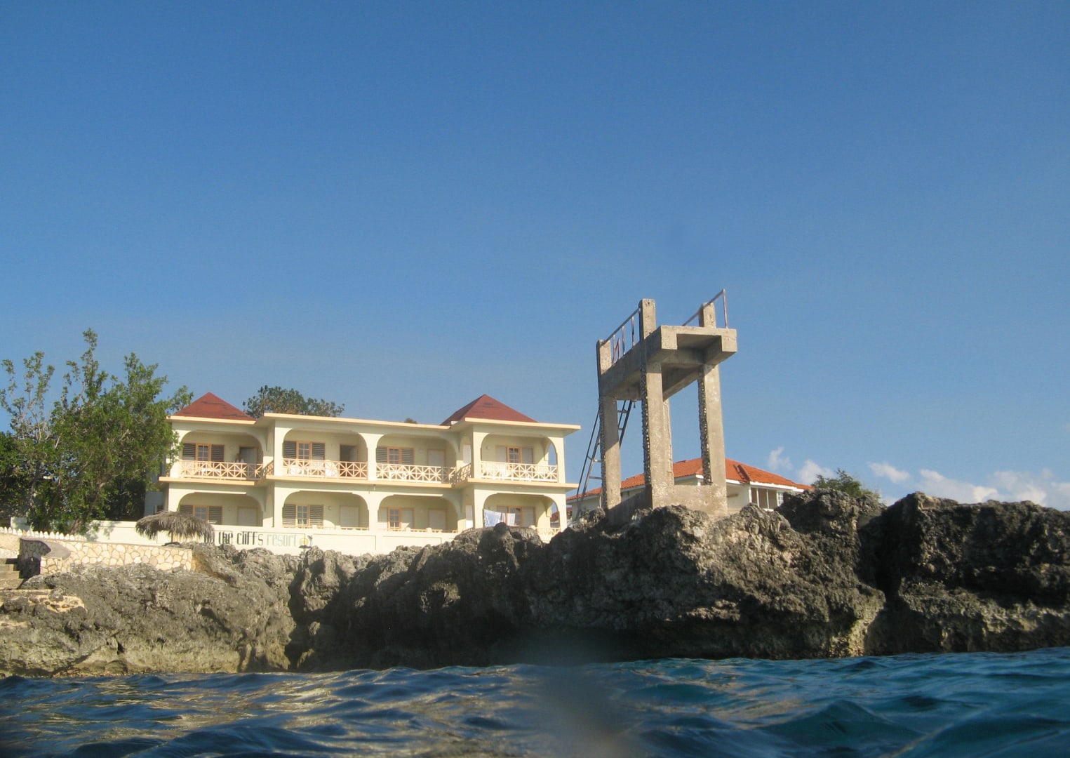 Blick aus dem Wasser zum Hotel