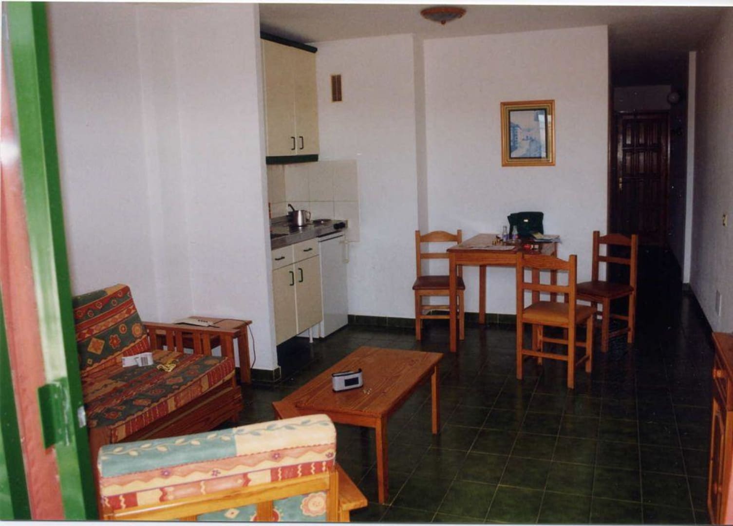 dasselbe Zimmer diesmal im Hintergrund die Küchenzeile mit Kühlschrank, Kochgelegenheit, Sitzgruppe. Um die Ecke, hier nicht zu sehen das separate Schlafzimmer zum Innenhof, sehr laut und hellhörig.