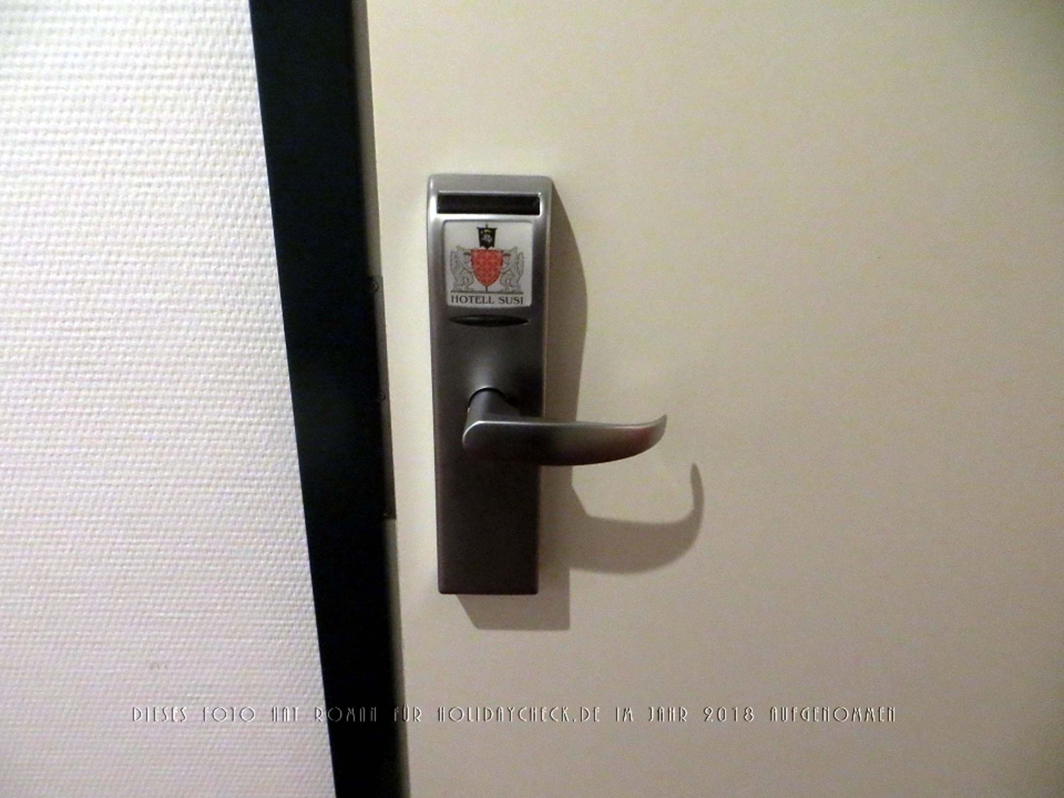 Hotelzimmertür mit Kartenleser von außen betrachtet.