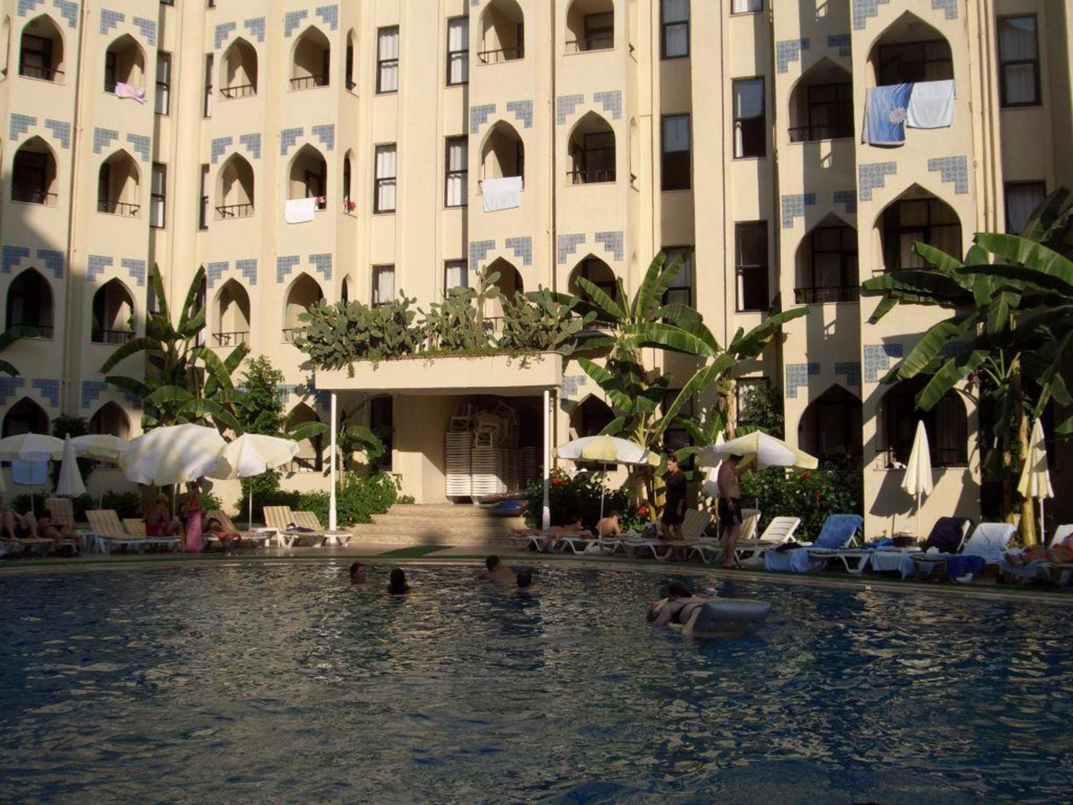 Blick auf das Hotel, Pool aber viel im Schatten