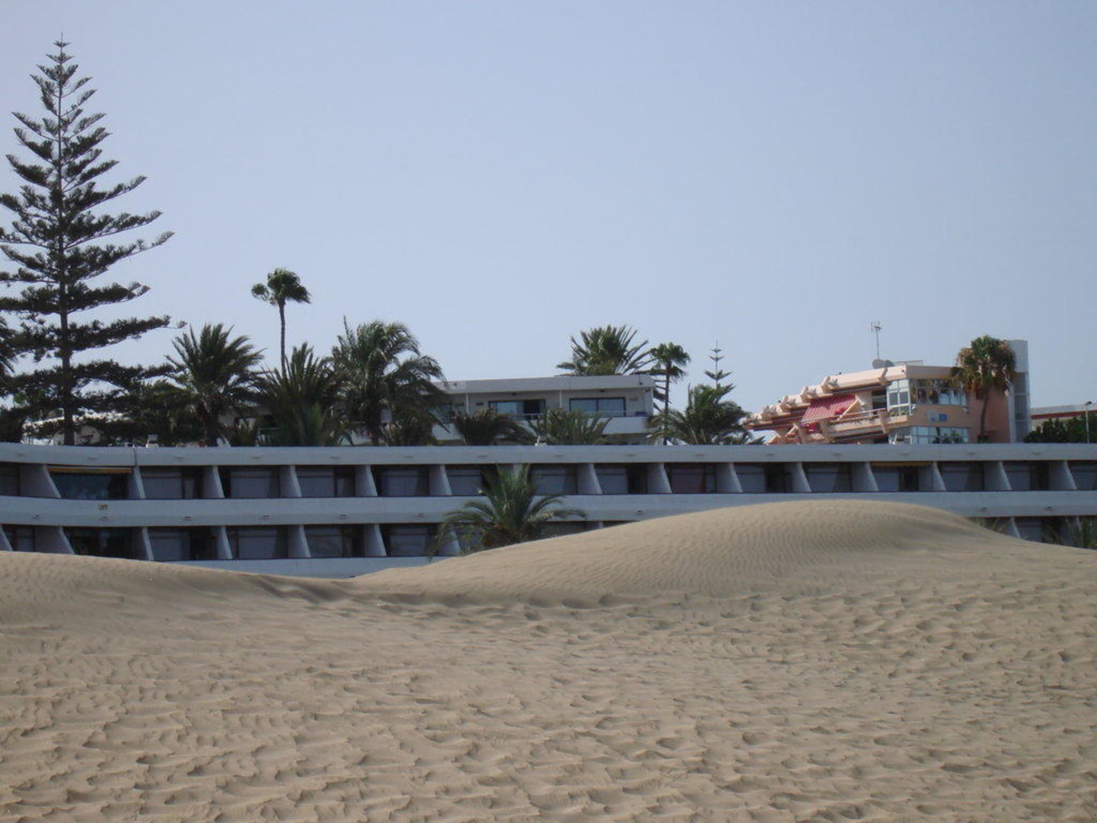 von den Dünen aus betrachtet, im Vordergrund ist das Hotel Santa Monica, oberhalb davon (das kleine weiße Gebäude) ist das Taboga gelegen