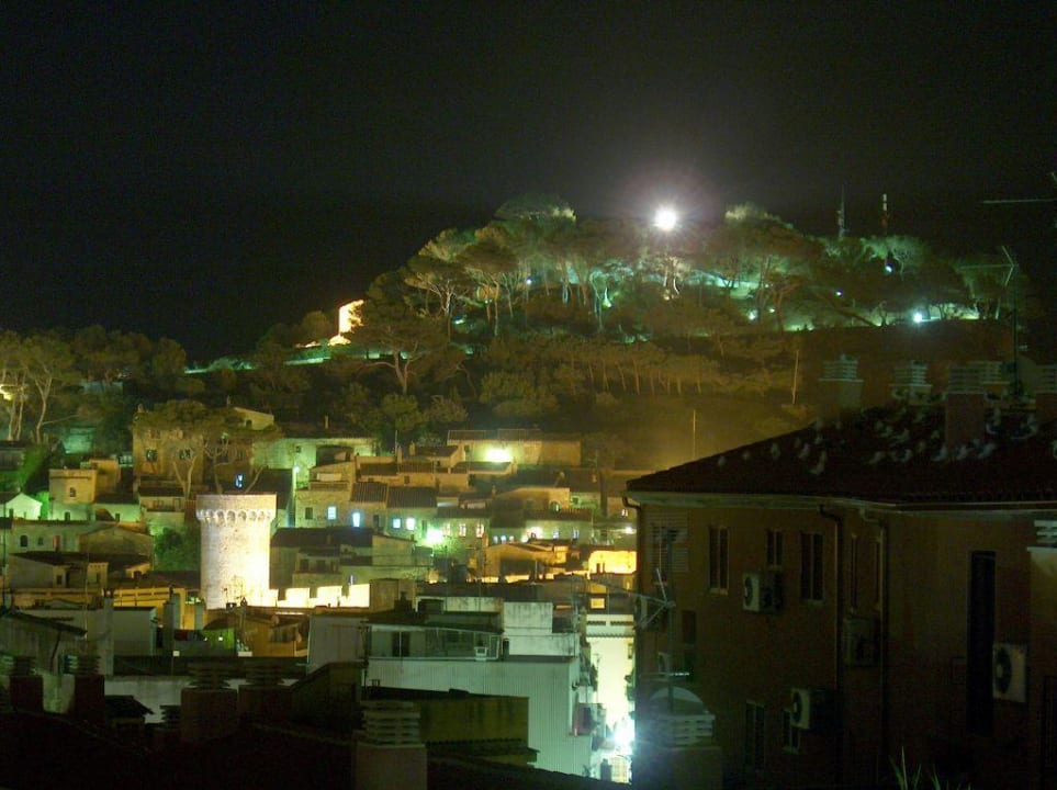 Blick über das Städtchen zur Burg von der Dachterasse aus in der Nacht.