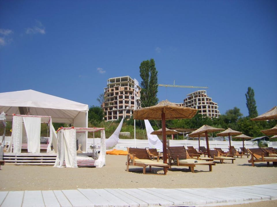 w oddali budujący się hotel, nie przeszkadza w plażowaniu po lewej jedno z łóżek z baldachimami w plażowym barze - najlepszym miejscu na całej plaży