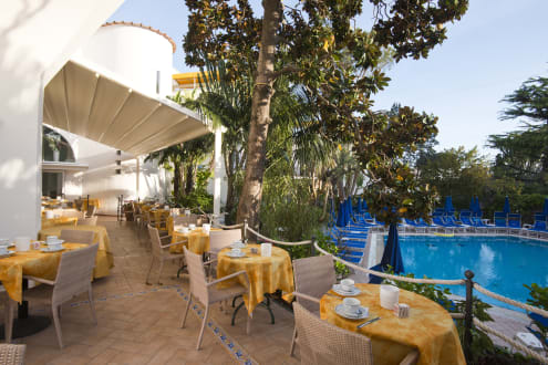 Schöne Frühstücksterrasse mit Blick auf den Pool.