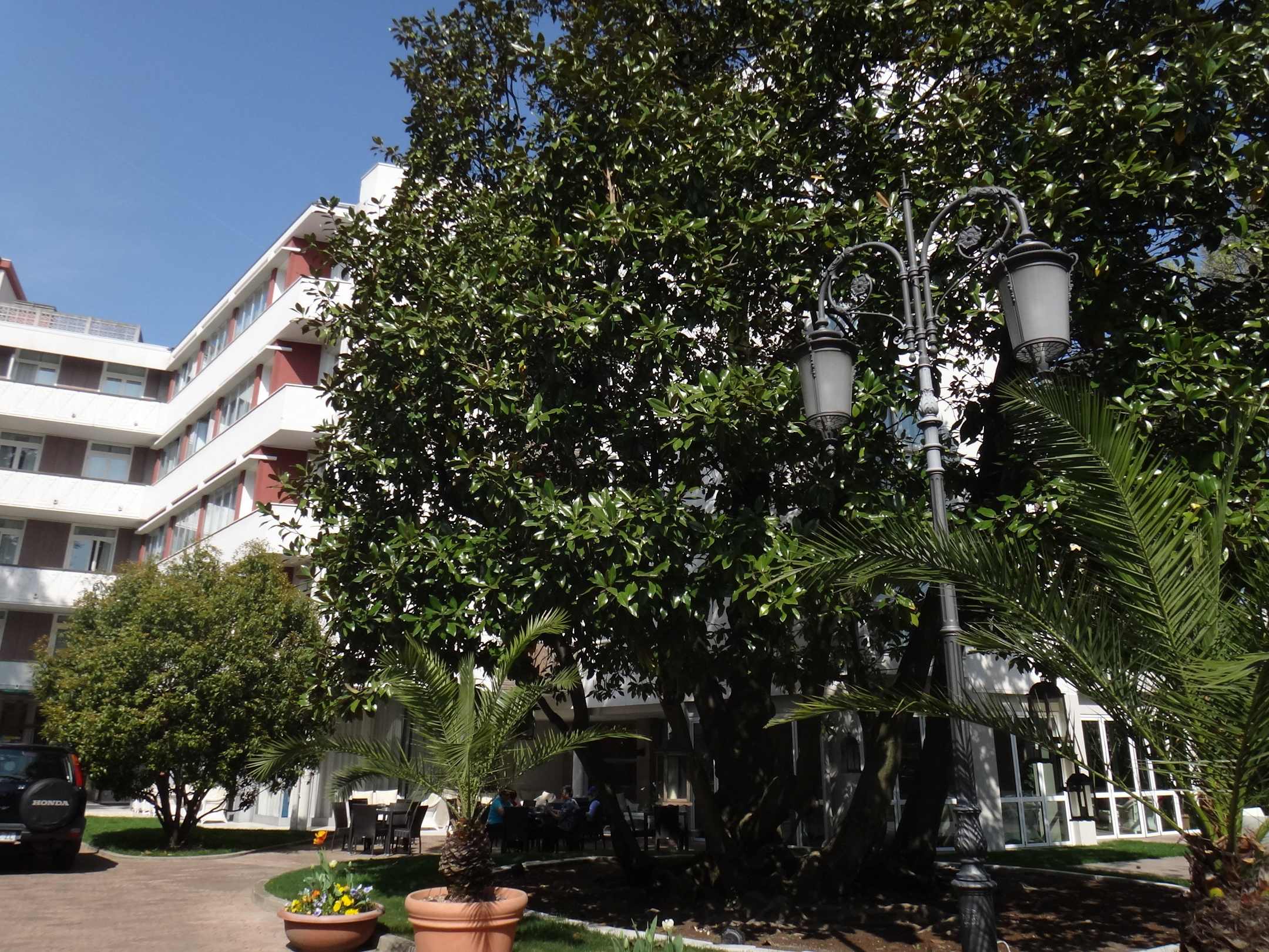 Von einem Park umgeben