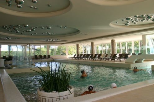 Hallenbad Großzügig angelegtes Hallenbad mit Umkleide und Tailettenanlage. An der einen Ecke des Bades ist auch eine Bar bzw. ein kleines Bistro.