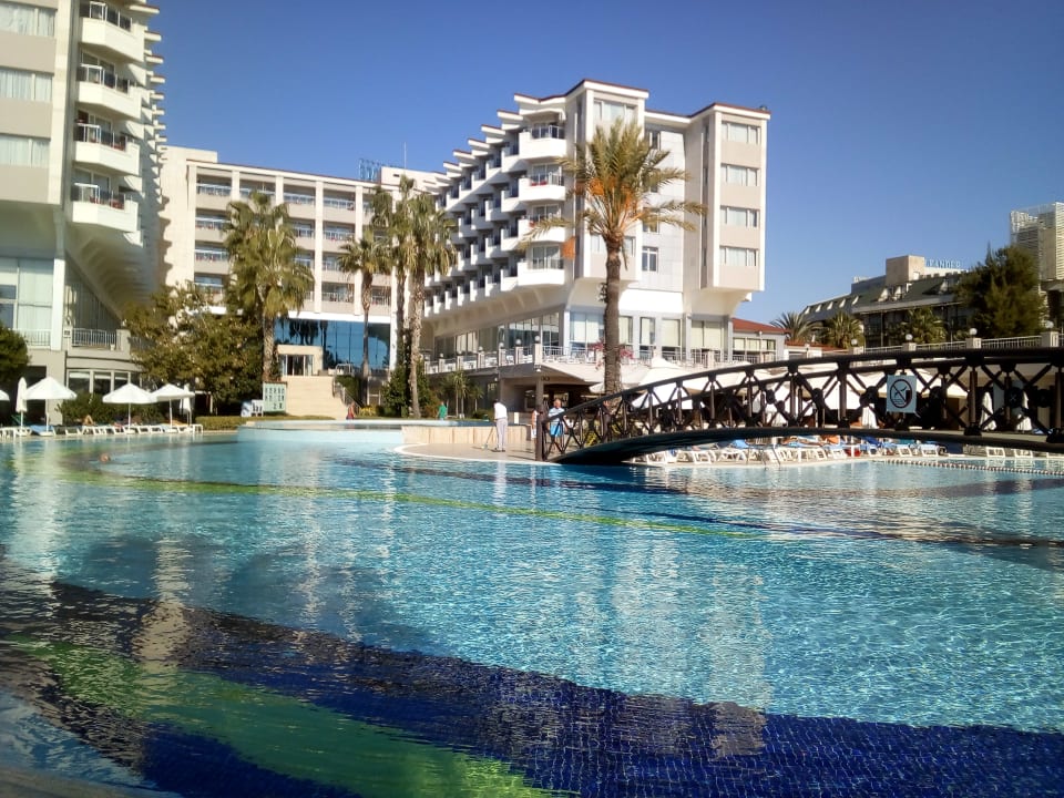 Blick auf das Hotel vom Pool, dahinter das Pool Restaurant