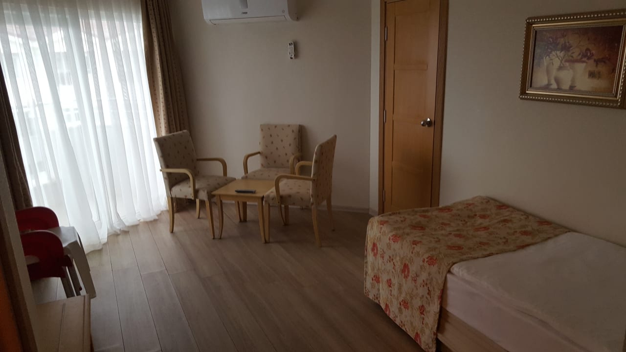 ZimmerFamily 2 Schlafzimmer - Wohnzimmer mit Einzelbett (+Ausziehbett unten drin) und Verbindungstür zu einem weiteren Doppelzimmer.