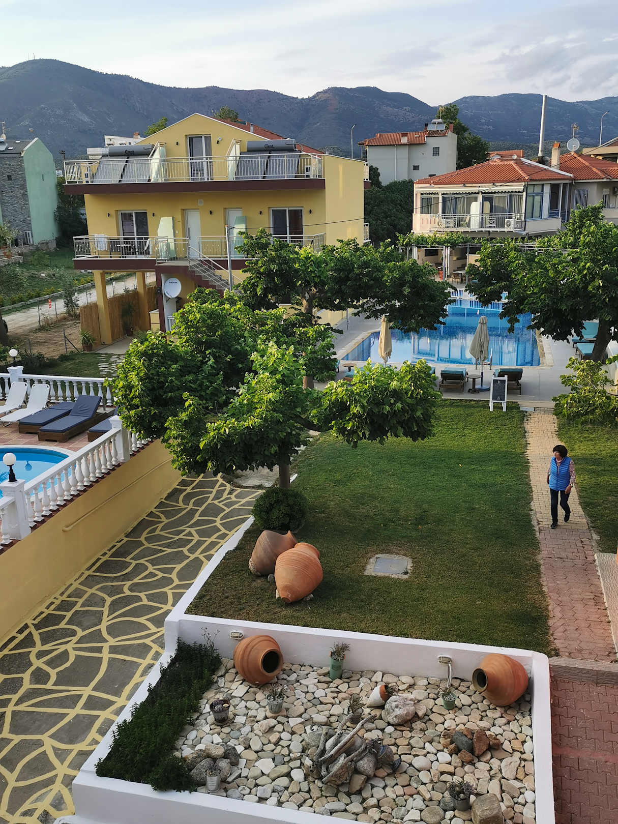Ausblick auf die Gartenanlage und den Pool. Im Hintergrund ist das Thalassies Nouveau.