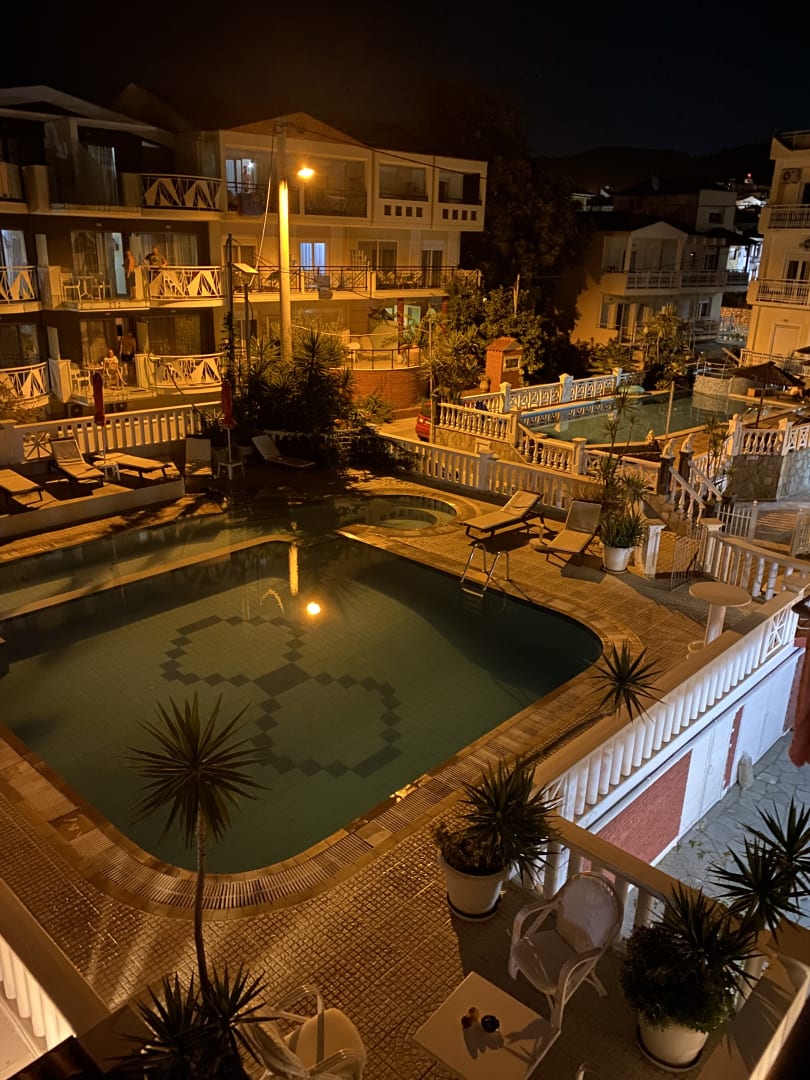 Blick vom Balkon - Pools der Hotels rundum