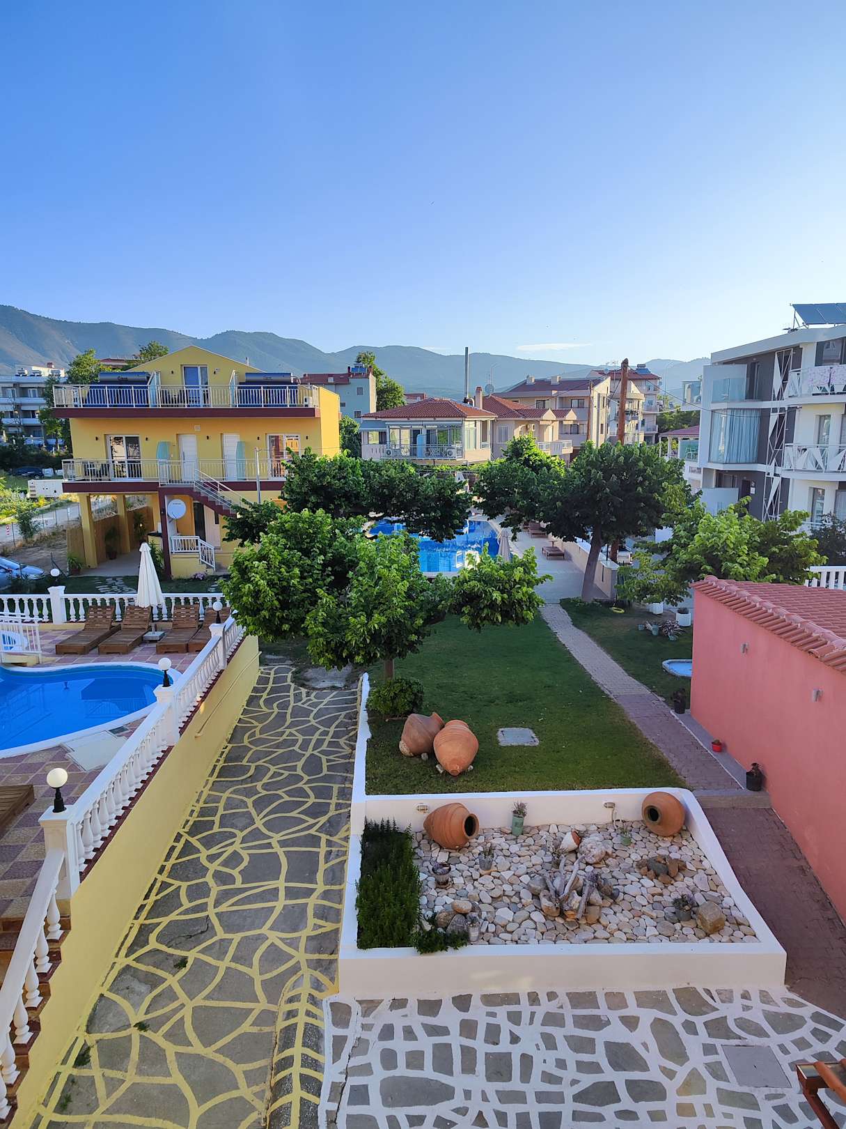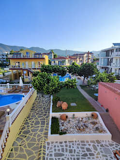 Blick vom Balkon auf den Garten und den Pool