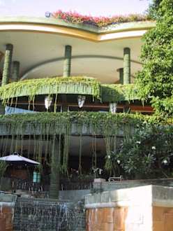 Restaurant vom oberen Pool aus gesehen, darüber Lobby