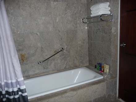 Badewanne mit Duschvorhang; keine DuscheIn unserem Zimmer hatten wir nur eine Badewanne, die nicht so praktisch ist wie eine separate Dusche.