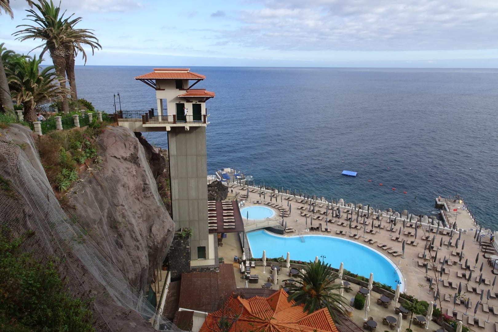 Ausblick auf den Atlantik. Lift, der vom Hotel zu den Outdoor Pools und zum Meer führt.
