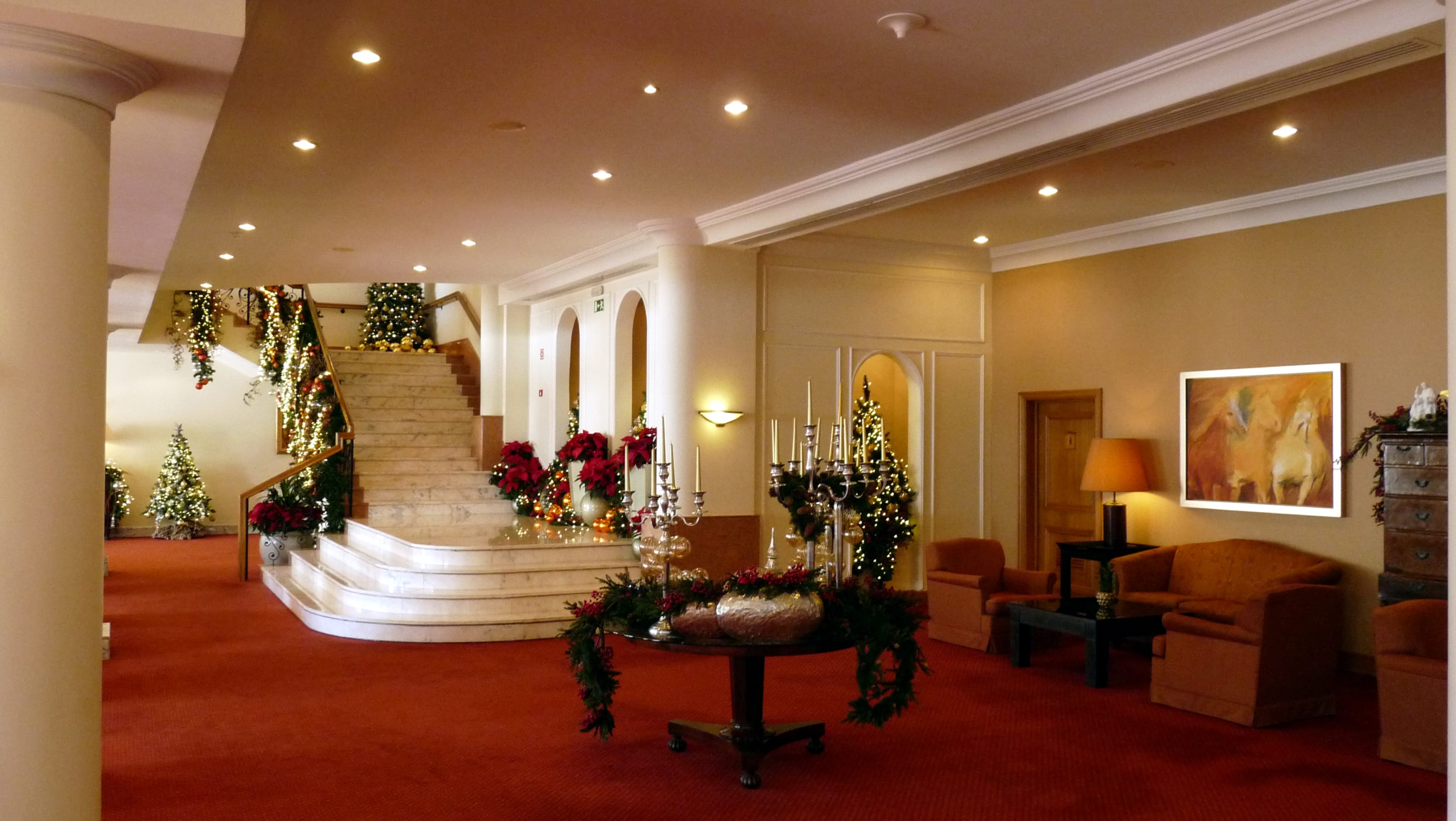 Untere Lobby zur Vorweihnachtszeit. Zugang zum Frühstücksrestaurant.