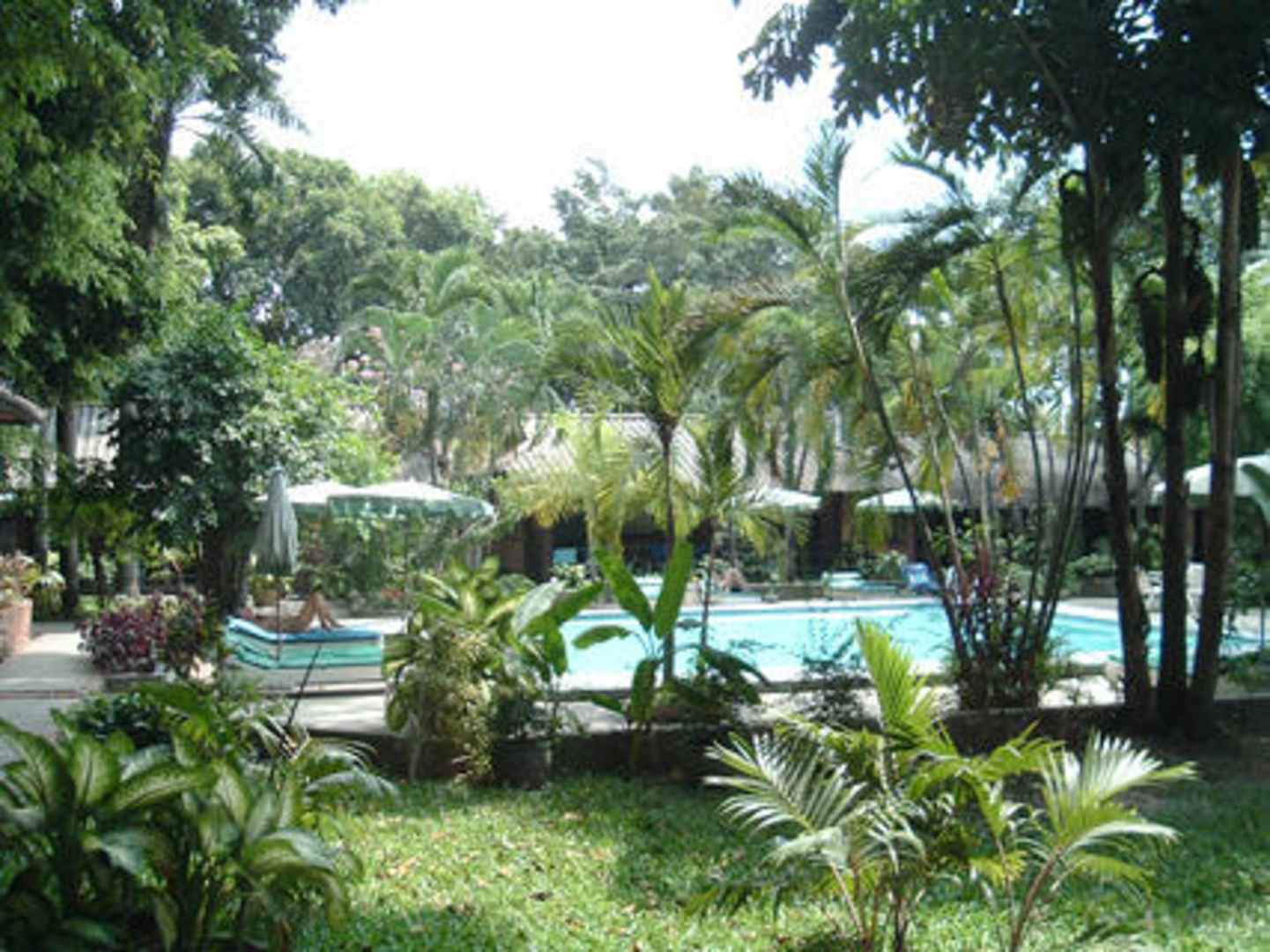 Blick durch den tropischen Garten auf den hinteren Pool