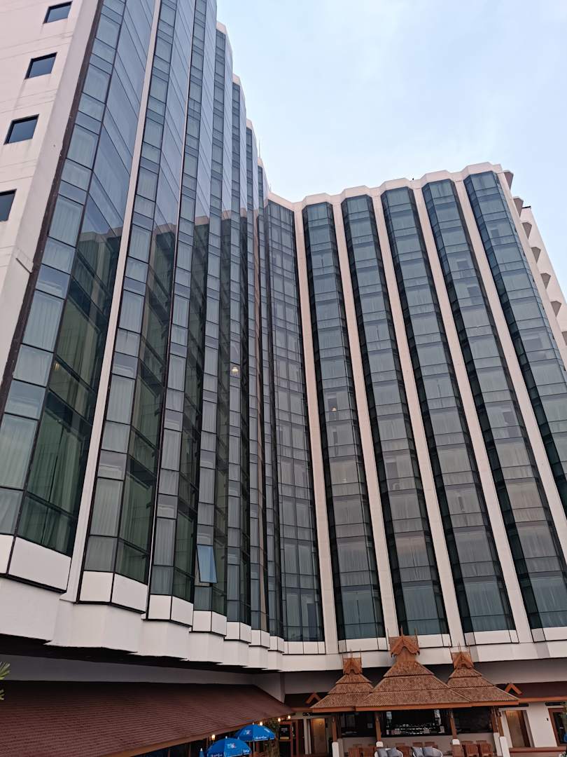 Blick vom Pool zum Hotel