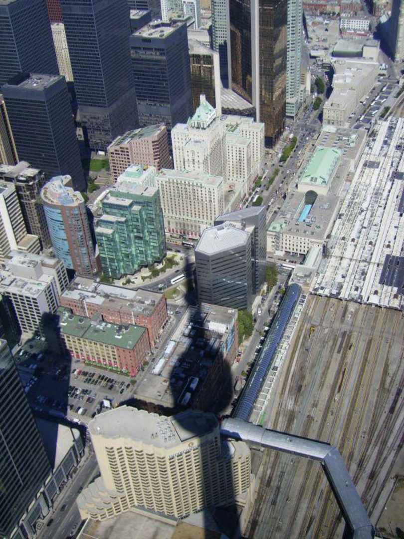 Das Hotel Fairmont Royal York in der Front-Street in Toronto, fotografiert vom CN-Tower. Unten in der Mitte des Bildes sieht man auch das Hotel Intercontinental.