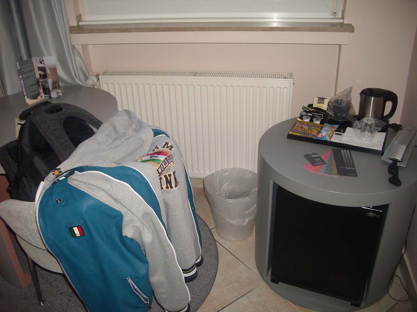 Schreibtisch links, rechts unten die Minibar