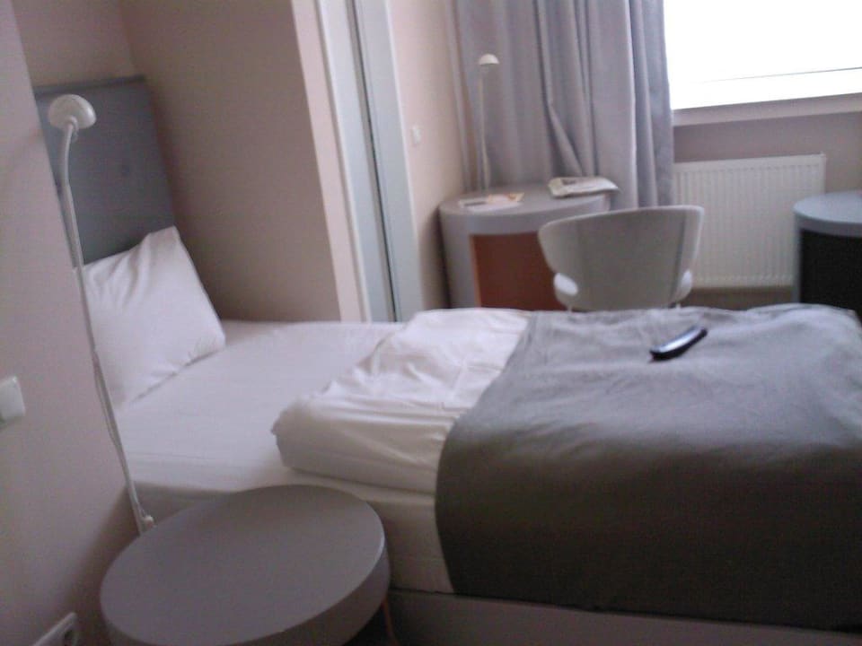 Einzelbett...im HIntergrund kleiner Tisch mit Stuhl...rechts die Minibar