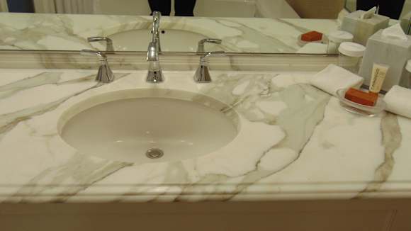Bad: Wchtisch Ton sur Ton mit den Marmorfliesen