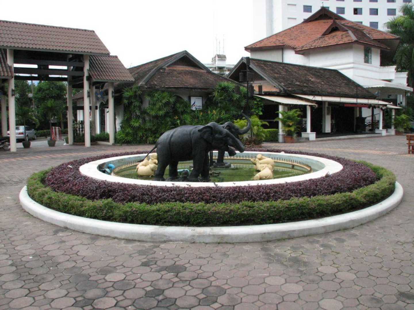 Elefanten im Teich. Am Abend spielt eine Band rechts auf der Bühne Musik.