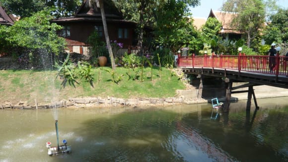 Blick vom Restaurant über den Bach zur Hotel / Bungalowanlage
