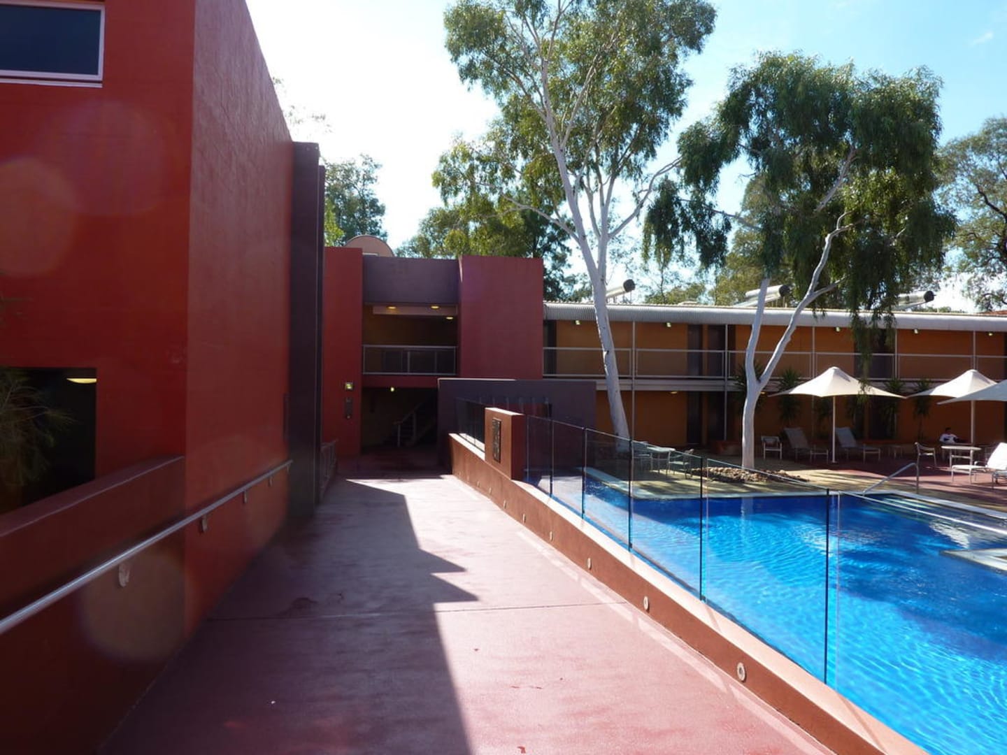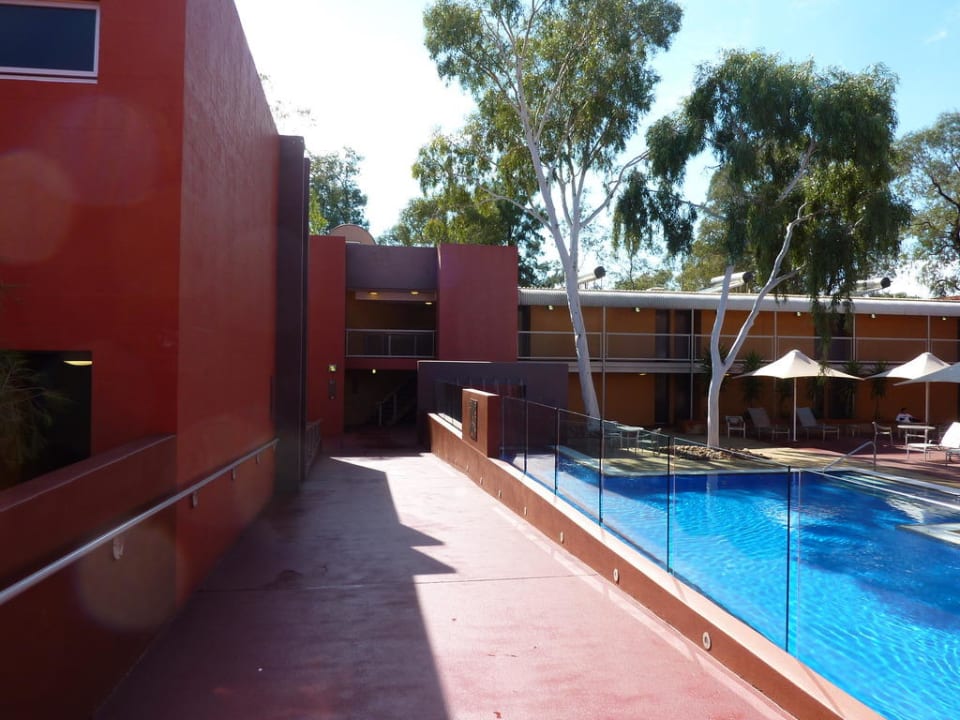 Rechts der Pool, links der Zugang zu den Zimmern