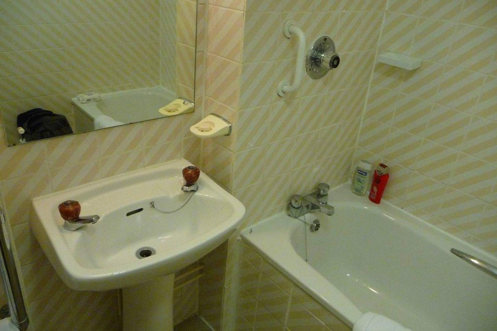getrennte Warm- und Kaltwasserhähne, Wanne mit Dusche, die defekt war