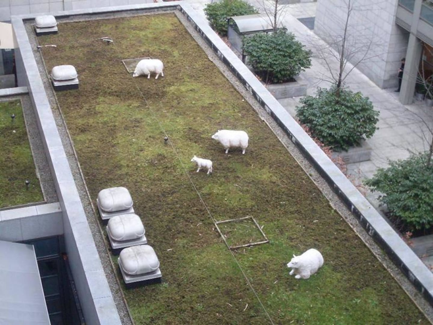 Schafe auf dem HoteldachAuf den ersten Blick wie echt - eine Herde "Schafe" weidet auf einem begrünten Dach der Hotelanlage.