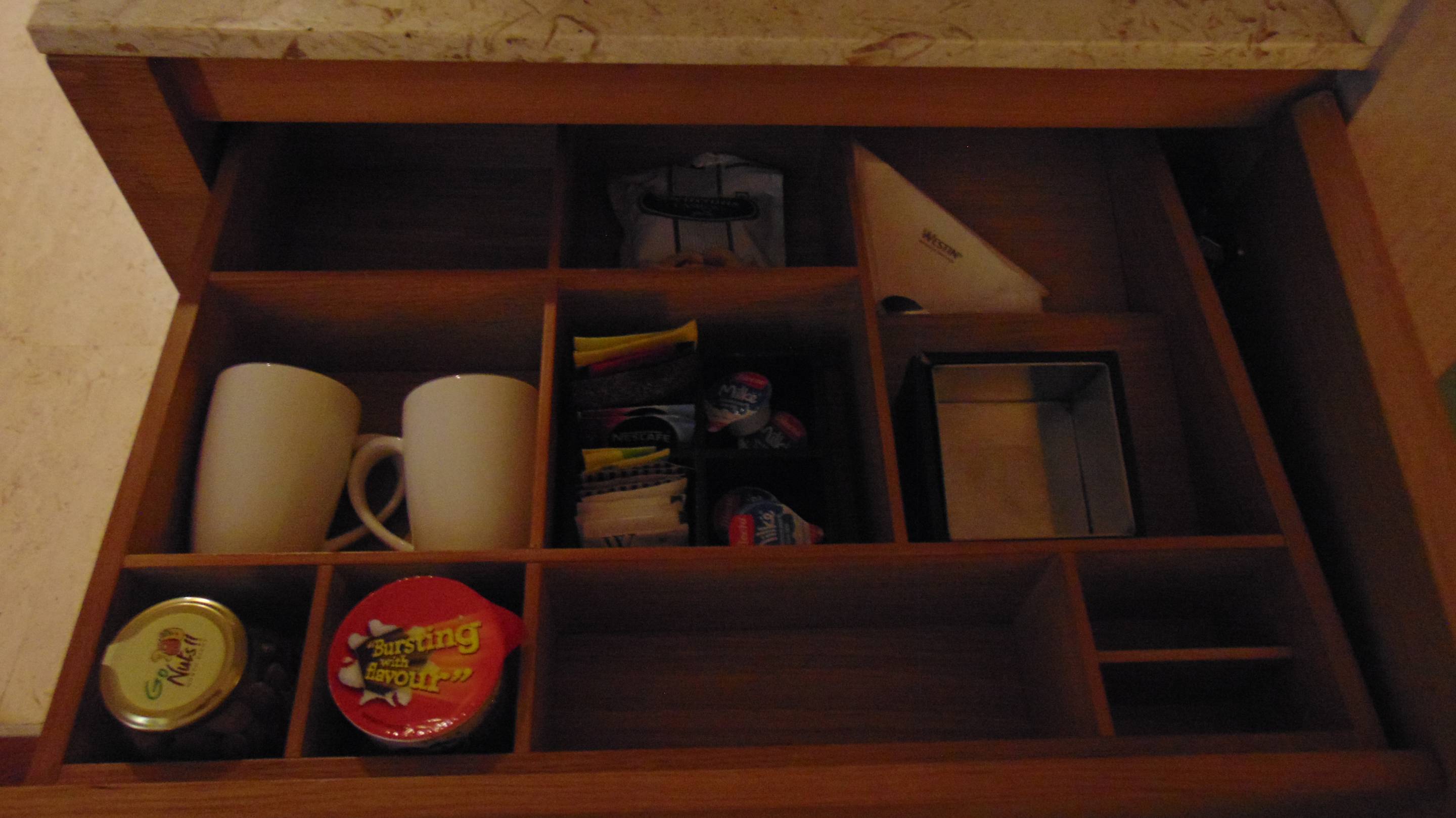 Schublade mit Amenitieszur Kaffee- und Teezubereitung und käuflch erwerblichen Knabber-Snacks