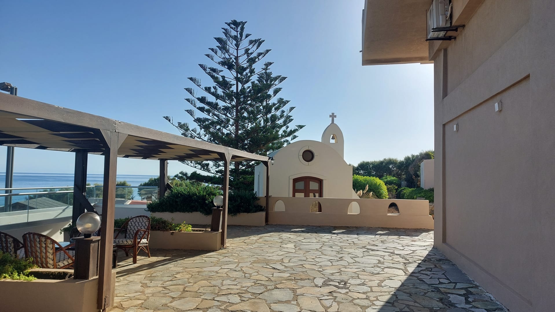 Blick auf die Hotelkapelle, dahinter das Amphitheater.