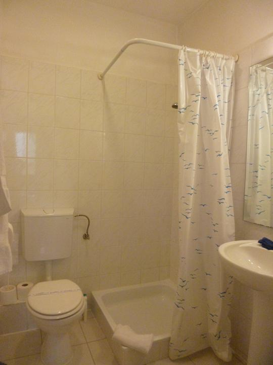 DuschbadZimmer 14. Genau wie im Zimmer 11 ist auch hier ein Mangel an Ablagemöglichkeiten für Shampoo und Co zu beanstanden.