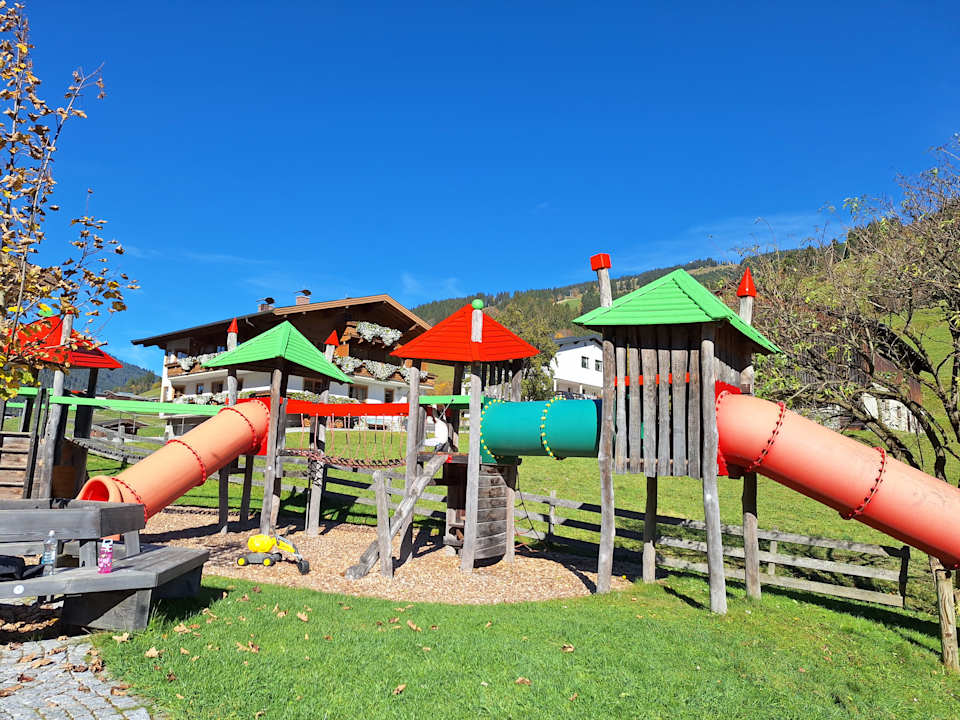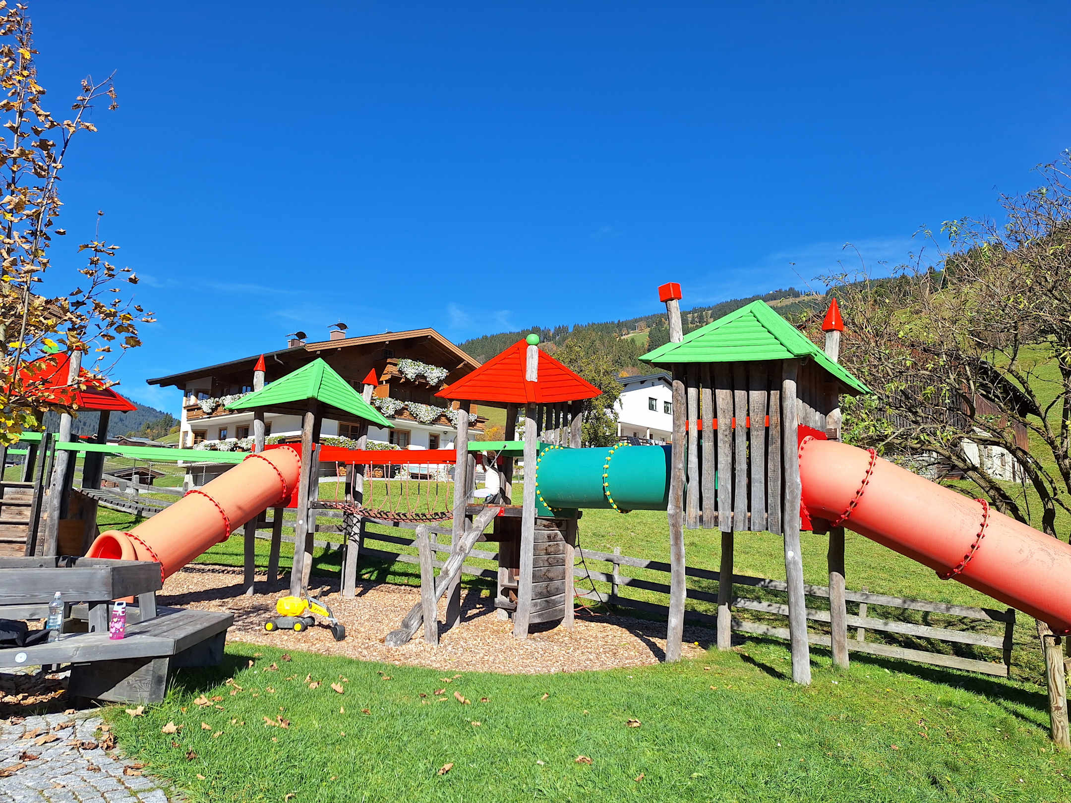 Spielplatz in der Sonne. Blick von einem der zwei Liegestühle für die Eltern. 😍