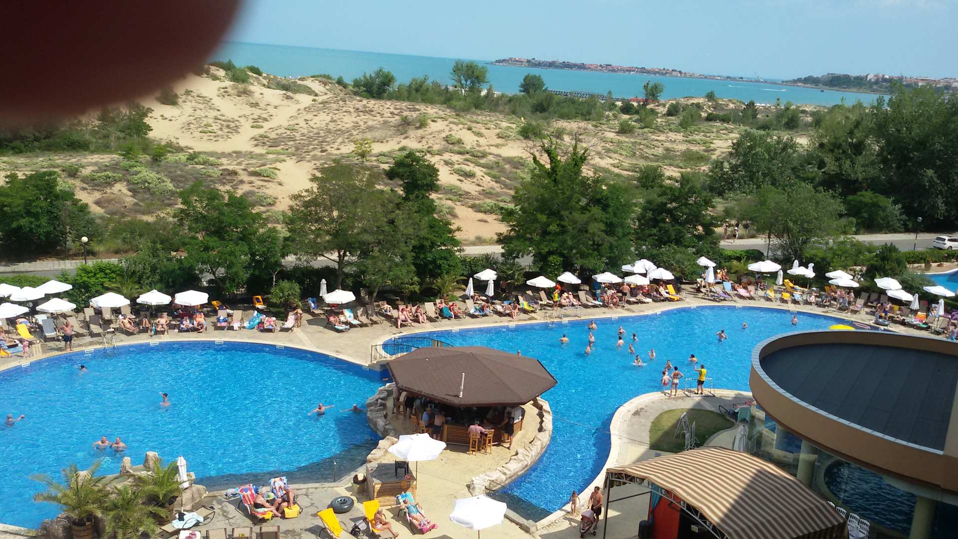 Blick von unserem Balkon 5. Stock auf die Pool- u. Gartenanlage sowie Meerblick.