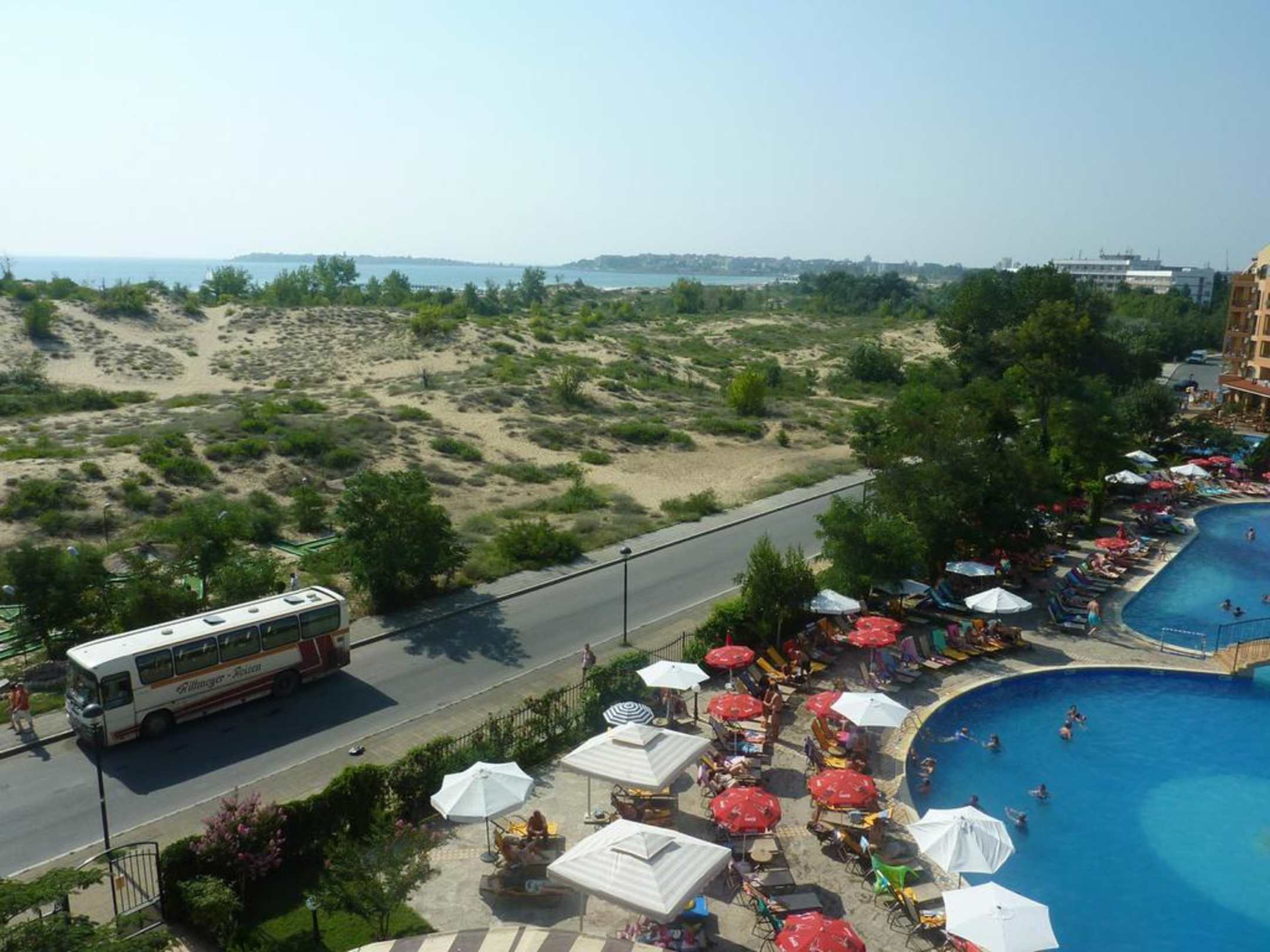 Blick zum Strand aus dem vierten Stock. Im Hintergrund Nessebar.