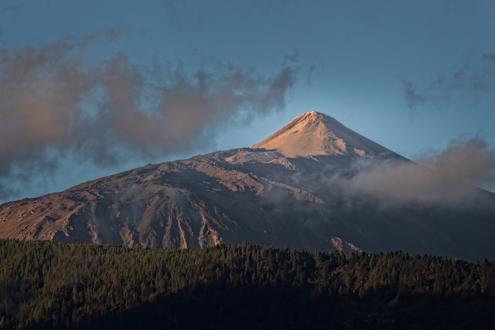 Blick vom Zimmerbalkon: Die aufgehende Sonne strahlt auf den Teide
