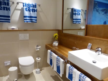 Bad in Zimmer 306 mit viel Abstellfläche und immer frischen Blumen.