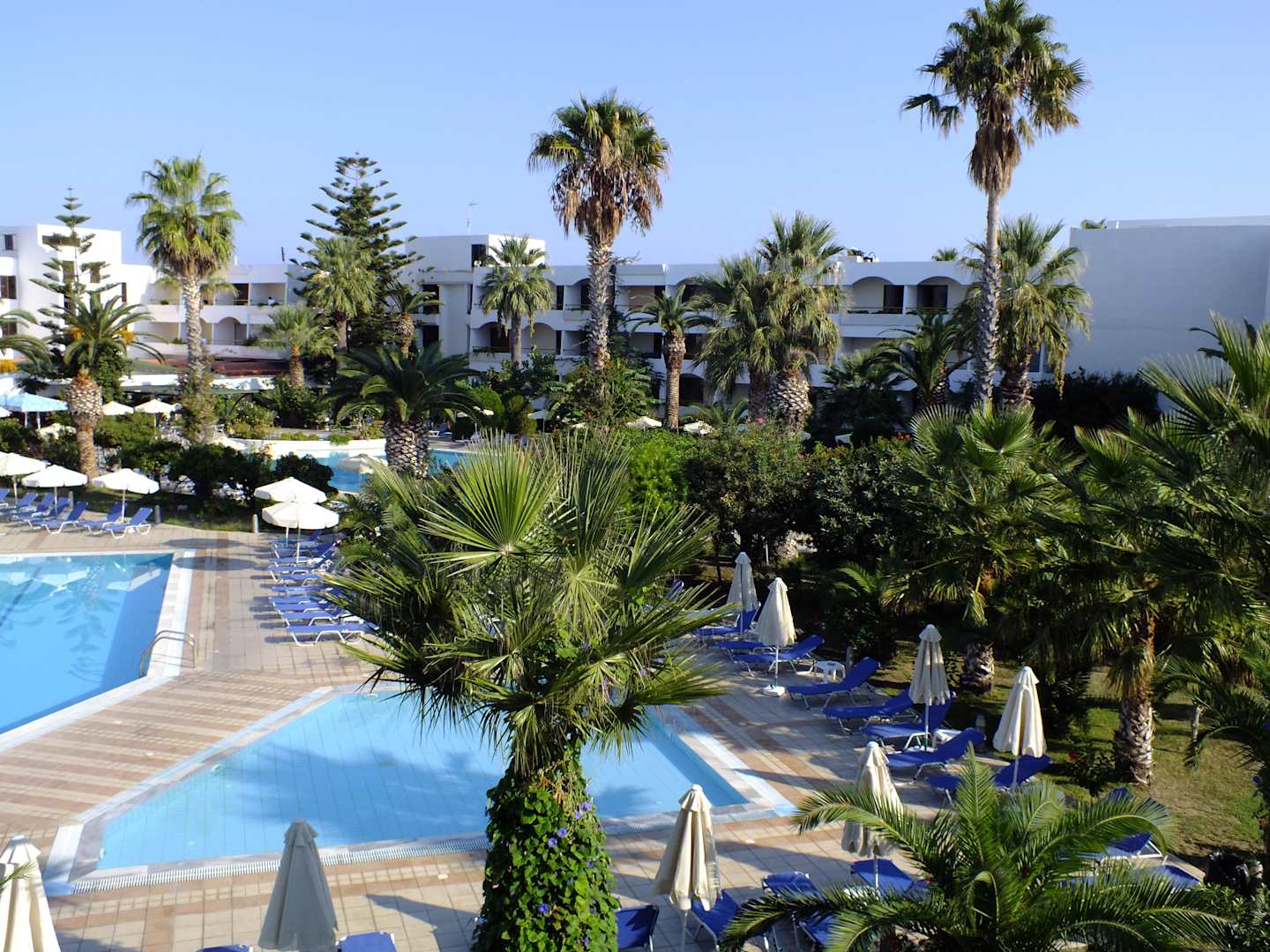 Poolanlage Tigaki BeachNette Grünanlage mit Palmen verschiedene farbige Blumen, Der Pool wurde jeden Morgen mit Wasser abgespritzt.