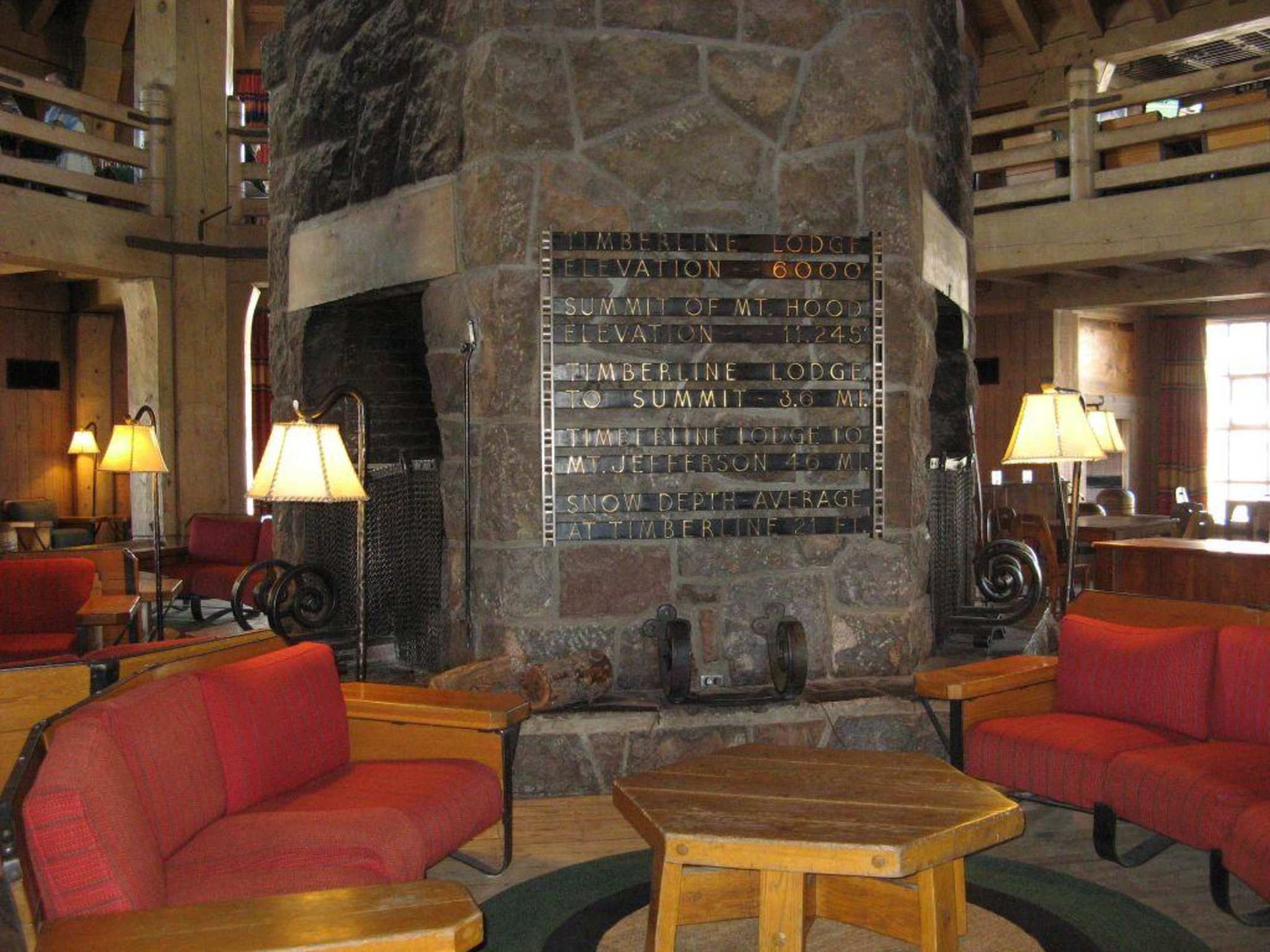 Timberline Lodge: AufenthaltsraumTimberline Lodge, Oregon: Aufenthaltsraum mit Infotafel, im oberen Stockwerk befindet sich eine Bar