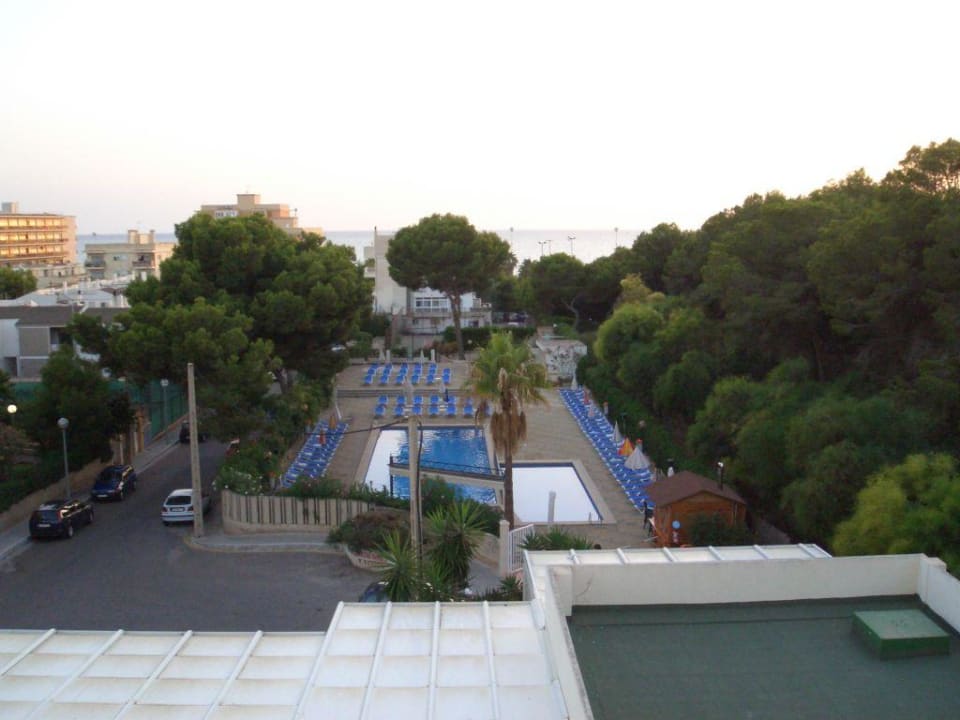 Blick vom Balkon auf den Pool Richtung Meer
